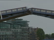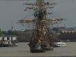 Replica of Gotheborg merchant ship sails up River Thames and through Tower Bridge; ENGLAND: London:EXTTower Bridge opening up to allow passage of a replica of the merchant sailing ship 'Gotheborg' to pass through towed by a tug