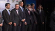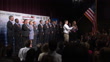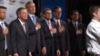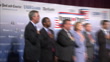 CLEAN: Republican presidential contenders arrive in New Hampshire for debate. Shows interior shots Republican candidates Jeb Bush, Ben Carson, Chris Christie, Carly Fiorina, Lindsey Graham, Bobby Jindal, John Kasich, George Pataki, Rick Perry and Rick Santorum & Scott Walker pledge of allegiance on stage at St Anselm's College. on August 03, 2015 in Manchester, New Hampshire.