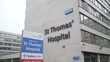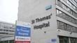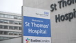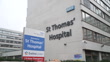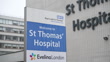 Resident doctors strikes: picket line in London; ENGLAND: London: St Thomas' Hospital:EXT / RAINSign 'Welcome to St Thomas' Hospital'