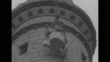 Title card: "Restore Standish Memorial Statue-Duxbury, Mass-Gigantic figure of doughty colonial captain is hoisted to top of Bay State shaft" / CU Standish torso with head wrapped in ropes or cables / side view of same / CU torso being hoisted up slowly beside shaft wall / granite shaft with torso suspended from cable, tops of trees below / CU torso against shaft wall / torso against shaft, wind blows trees below / torso at top of shaft below parapet / looking up shaft with suspended torso / CU torso in front of lower part of statue, can see worker and braces of hoisting system / torso suspended above statue legs, workers looking up, can see cables / workers on simple scaffolding completing torso attachment to legs / monument on Captain's Hill / title card: "Coronation of Mary Waddell-Pasadena, Cal-she is given crown as Queen of the Tournament of Roses"