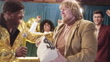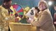 A fun depiction of a competitive TV game show, stylized in late 1970's or early 1980's fashion. The host, an African American man in a stunning gold blazer, watches as contestants spin a colored wheel to win cash prizes.
