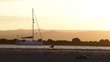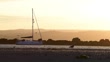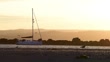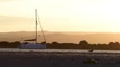July 30, ‎2024. A moored sail boat's bow faces against the tide . In silhouette, coastal gulls forage for food along the shore. Idyllic beach and sea setting. Romantic sky. Dusk. Therapy. Marazion, Cornwall, England. United Kingdom