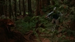 PAN RIGHT TO LEFT AS TEENAGED BOY RIDES BICYCLE THROUGH SHADY FOREST OR WILDERNESS THEN TURNS AWAY FROM POV AND RIDES ACROSS FALLEN TREE TRUNK OR LOG. BOY WEARS SILVER HELMET. BIKE IS CHROME PLATED AND HAS LONG, HIGH HANDLEBARS AND SIDE VIEW MIRRORS. PINE TREES, BRUSH, FERNS AND BARK IN DENSE FOREST. STUNTS. RIDERS. MOUNTAIN BIKING.