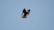 Ringed kingfisher (Megaceryle torquata) hovers overhead in blue sky. (Core number: FKAY491X rushes)