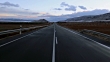 Subjective view from a moving vehicle of a road in a straight line, during a sunset after a light snowfall