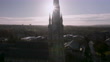 Roating and rising drone shot of Stapleton church spire looking into Bristol city centre.