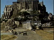 Robert Capa with his camera on the beach near Mont Saint-Michel, just after D-Day / slow tilt up Mont Saint-Michel.