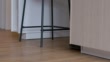 Robot vacuum cleaner vacuuming under the kitchen cabinets while bumping into a bar stool by the kitchen island.