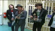 Various of Carl Barat, Didz Hammond, Anthony Rossomando, Gary Powell (Members of Dirty Pretty Things rock band) performing song at entrance to prison SOT
