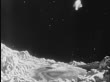 B/W rocket (model) descending then flying low over moon surface - stock video