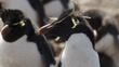 Close up of a rockhopper penguin (Eudyptes chrysocome) looking around amongst its colony. Wind blows through its feathered hair, Patagonia. (FKAD027Y - Clip taken from programme rushes - 21944).