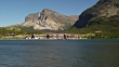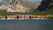 Rocky mountains tower behind the Many Glacier Lodge on Swiftcurrent Lake.