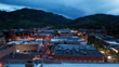 Aerial view of downtown Boulder, Colorado at dusk with Pearl Street Mall visible among brick buildings and commercial structures. The video shows the historic shopping district with illuminated streets and businesses against the backdrop of the Rocky Mountain foothills. Camera moving forward over the roofs to reveal more of the urban landscape, capturing the contrast between the developed downtown area and the natural mountain setting. Stormy clouds hover over the mountains, creating a dramatic twilight atmosphere.