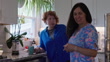 Two women have animated conversation in bright modern kitchen. Redhead woman in blue button-up shirt holds turquoise mug while brunette woman in floral pattern top holds glass of dark beverage. Kitchen features white cabinets, granite countertops, and hanging plants by window. Coffee press visible on counter alongside kitchen essentials. Camera remains static throughout sequence while women's expressions and positions shift slightly during their engaging conversation.