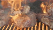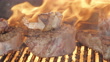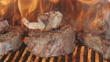 Row of three Rib Eye Steaks with succulent jumbo shrimp or prawns wrapped in bacon on an old fashioned charcoal grill with flames leaping up to sear them. Cooking is bringing out a golden brown and red color on the shrimp