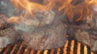 Row of three Rib Eye Steaks with succulent jumbo shrimp or prawns wrapped in bacon on an old fashioned charcoal grill with flames leaping up to sear them. Cooking is bringing out a golden brown and red color on the shrimp - 4K stock video