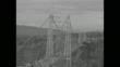 WS Royal Gorge Bridge over Royal Gorge and landscape beyond, people gathered on bridge / pan down rock face to railroad tracks and telephone poles beside Arkansas River / people looking over bridge railing at daredevil Ben Mouton performing on trapeze suspended over gorge / CU Mouton on trapeze, river down below / people at railing watching Mouton / CU Mouton on trapeze / Note: exact month/day not known