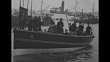 HMS Royal Oak in Norwegian waters / coffin and catafalque on rear of the ship / view of ship far below with fires in rectangular boxes / King Haakon VII and Crown Prince Olav, wife Crown Princess Martha with children (in distance, walking past flame atop column) / two shots of coffin on skiff / small fires atop wall / Norwegian flag / royal family as coffin removed from boat / casket atop rear of truck / cannon fires / people behind two columns topped with fires / HMS Royal Oak / coffin on skiff