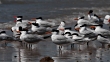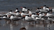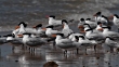 A group of Royal Terns (Thalasseus maximus), Sandwich Terns (Thalasseus sandvicensis), and Common Terns (Sterna hirundo) on the beach of the Bolivar Peninsula, east Texas.