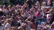 High angle shot of crowds gathering behind barriers along The Long Walk in Windsor Great Park with Windosr Castle in distance/ various of crowd members and Union Jack flags/