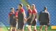 RUGBY UNION: Rugby World Cup 2015: England training / Stuart Lancaster press conference; ENGLAND: Manchester: Etihad Stadium:EXTEngland team out onto pitch led by Chris Robshaw (England Captain) / various shots of England training session including Robshaw, James Haskell, Nick Easter, Joe Launchbury, Owen Farrell, Dan Cole (England players) and coaches Stuart Lancaster (England Head Coach), Mike Catt, Andy Farrell and Graham Rowntree