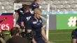 Players and coaches out and along onto pitch / Wide shot stadium and team warming up / Vern Cotter (Scotland Head Coach) along sideline / Team warming up and stretching / Greig Laidlaw (Scotland captain) running along with ball / Blair Cowan stretching against posts / fans watching from stands / Duncan Weir / Vern Cotter along