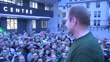 RUGBY UNION: Rugby World Cup 2015: Springboks and supporters jog in memory of 1995 World Cup final; ENGLAND: London:EXT / EARLY MIORNING***FLASH PHOTOGRAPHY***GVs of former springbok players and fans jogging along The Mall cheering, some carrying South African flags / joggers crossing bridge / Springboks on platform outside Queen Elizabeth II conference centre surrounded by supporters / Francois Pienaar (Springboks captain in 1995) addressing crowd SOT /