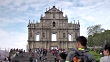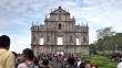 WS Ruins of St. Paul's church, stone building facade w/ ornate carvings, sculptures, statues, unidentified people walking around.
