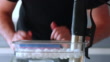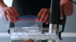 Rump steak sous vide cooking. Raw rump steak and olive oil in polyethylene zip-loc sous vide bag. Putting raw meat in bag, pouring in olive oil, submerging bag using water displacement method and eventually closing bag. Immersion circulator, polycarbonate water bath and insulation balls in field of view.