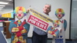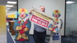 MADRID, SPAIN - FEBRUARY 11: (COMPILATION) Ryanair CEO, Michael O'Leary, holds a banner with Spain's Minister of Consumer Affairs, Pablo Bustinduy, worn as a clown and the message "Crazy Prices reservation (before a clown raise fares). 179,000 seats for 19,99 €" during a statement on February 11, 2025, in Madrid, Spain. O'Leary addressed the current situation of the company on hand luggage and related policies after the latest controversies with the Government. (Footage by Europa Press via Getty Images)