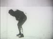 B/W 1920's man on ice skates with jet pack on back falls down on ground - stock video