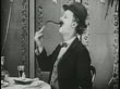 B/W 1920's man (Ben Turpin) trying to eat twisting, bending piece of asparagus - stock video