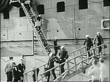 B/W 1945 sailors disembarking from aircraft carrier Saratoga in San Francisco / newsreel