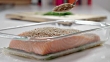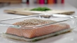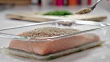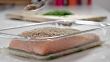 Additional salt, sugar and spice mix sprinkled over a fresh salmon filet in a glass baking dish. Side angle.