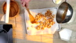 Salted caramel popcorn recipe. Mixed popcorn with salted caramel sauce. Emptying saucepan. Baking paper on top of baking sheet. High point of view. Light effect.