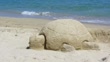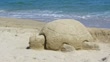 Sand turtle sculpture on the beach in Sithonia in Greece.