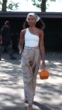 COPENHAGEN, DENMARK - AUGUST 10: (SLOW-MO) Sara Flaaen Licius wears a head scarf and high-waisted beige pants outside Samsøe Samsøe during Copenhagen Fashion Week Spring/Summer 2023 on August 10, 2022 in Copenhagen, Denmark. (Footage by Christian Vierig/Getty Images)