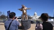 WASHINGTON DC, US - MAR. 10: A satirical statue depicting US President Donald Trump and convicted sex offender Jeffrey Epstein in a "Titanic"-themed pose was displayed on the National Mall on Tuesday, March 10. Jeffrey Epstein, who faced charges of sexually abusing dozens of underage girls, including victims as young as 14, and running a sex trafficking network, was found dead in his cell at the Metropolitan Correctional Center in Manhattan, New York, on August 10, 2019, while in custody. Epstein’s court files named numerous high-profile individuals, including Prince Andrew, President Donald Trump, former US President Bill Clinton, former Israeli Prime Minister Ehud Barak, former US Vice President Al Gore, actor Kevin Spacey, illusionist David Copperfield, attorney Alan Dershowitz, and former New Mexico Governor Bill Richardson. The US Federal Bureau of Investigation (FBI), in conjunction with the Department of Justice, concluded that there was no evidence to support the existence of a “client list” of prominent figures. While some claims suggested that Epstein was killed to cover up the involvement of government officials, celebrities, and businesspeople, official investigations determined that Epstein died by suicide in his cell. (Footage by Fatih Aktaş/Anadolu Agency via Getty Images)