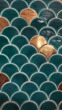 Scalloped pattern on enameled tile wall in blue and gold colors; full frame