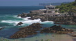 video of Santander, Cantabria showcases the stunning coastline with a rich blend of nature, history, and marine life. In the foreground, Camel Beach bustles with activity as people enjoy bathing in the clear, shallow waters. Above the beach, the Magdalena Palace park's pedestrian area overlooks the sea, with visitors observing seals in a public aquarium. Further along, the "Man and the Sea" open-air museum exhibits Spanish galleons, replicas of the ships used by Christopher Columbus during his voyages. The museum commemorates the voyages of sailor and scientist Vital Alsar, who completed a remarkable sailing expedition from Veracruz, Mexico, to Santander. Behind the museum stands the prominent Mouro Island with its lighthouse, and further in the distance, the rugged Cantabrian coastline stretches into the horizon, creating a breathtaking backdrop to this vibrant and historic scene.Santander, Cantabria, Spain - August 23, 2024