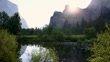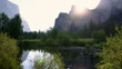 4k video footage of majestic landsdace with dramatic mountain range, reflection river and green forest during bright sunrise over Yosemite National park, California, the United States