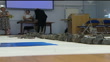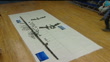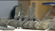 Skeleton of plesiosaur dinosaur laid out on mat (3 SHOTS)