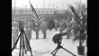 Scores of soldiers in sleeveless undershirts and khaki perform light calisthenics / they march past / soldiers remove their hats and don gas masks / clouds of gas with men walking through it / Saluting men facing machine gun on tripod and standing rifles / Under a covered platform, civilian and soldier unfurl flag: 'Company D, Fourth Ordnance Training Battalion' with Superman standing in front of a tank / A man marches with a flag and hands it off to another soldier / CU flag / soldiers marching forward in formation / Note: exact day not known
