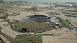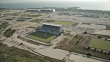 ELLINIKO, ATHENS, GREECE: HELLENIC REPUBLIC: HD: AERIAL WS ZI/ZO Sea, gulf coastline, vehicles driving up & down highway, Hellinikon Olympic Complex, empty fields, abandoned Hockey Centre, Baseball Centre in disrepair. Arenas, ballparks, stadiums, venues,decline, depressed economy, rundown, neglect.