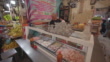 we see a vendor moving the fish, and a helper cleaning the table, on the sides we see incidental people around the market