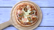 Seafood (shrimps, octopus, mussel and crab) pizza on wood tray
