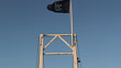 A seagull flies off of a wooden structure below a flag. - HD stock video