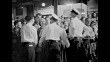 Searchlight sweeps exterior of Lowe's Ohio theater / lighted marquee "Dean Martin, Jerry Lewis, Paramount's 'The Caddy', World Premiere..'" and Martin and Lewis walking to microphone in bottom of frame / pan of large crowd to flashing lights of marquee / high angle of crowd / Martin and Lewis are handed bags of popcorn; joke around with pouring it into their mouths / police with crowd / Martin and Lewis pour popcorn on Perry Como and Eddie Fisher's heads / two shots of enthusiastic crowds laughing and waving / SOT Martin, 'let's all go in and see a picture', Perry Como lights a cigarette / full view of theater