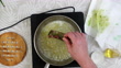 Knob of butter and cooking oil in cooking pan. Induction burner. Searing with herbs marinated rack of lamb.