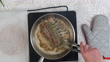 Searing in herbs marinated rack of lamb. Using serving tongs. Cooking pan on induction burner. Oven mitt. Placing seared meat on oven tray covered with baking paper.